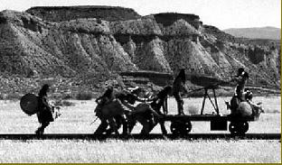 Denn auch diesmal half er seinem Stamm mit einer genialen Idee aus der Patsche: „Waba hu ku pfuuh!", was soviel bedeutet wie: „Genos-sen, wir investieren nun mehr in den Schienennahverkehr und besorgen uns ein öffentlich gefördertes Schienenfahrzeug, das auch noch umweltfreundlich ist. Lasst uns auf eine Draisine umsteigen!" Zufällig kam gerade ein Bergarbeiter, nämlich Salon Ceron, des Weges mit seiner Draisine. Die Indianer versteckten sich hinter einer